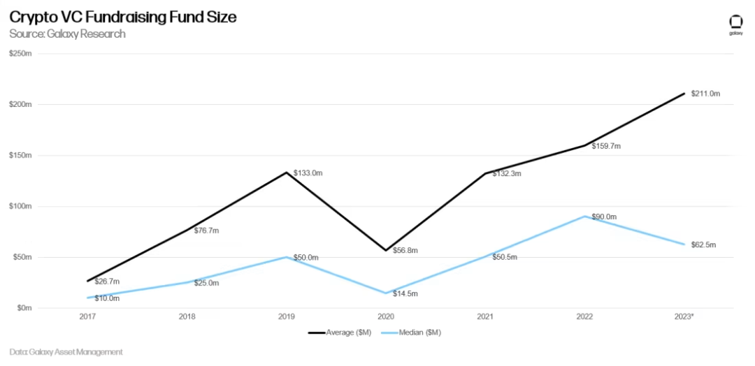 2023 年第一季度,14 只新的加密 VC 投资基金筹集了约 22 亿美元,平均基金规模增至 2.11 亿美元,基金规模中位数降至 6250 万美元。