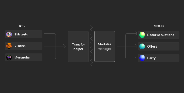 ZORA V3 使用允许 Zora DAO 部署新市场类型和更新版本的架构。市场模块的每个部署版本都是无需许可的,永远不能更改,但 DAO 可以将模块部署到 Zora 的批准空间中。这有助于开发人员选择他们使用的模块并轻松使用新版本而无需完全迁移(就像我们从 V2 到 V3 所做的那样),并降低了需要花费的总 gas。