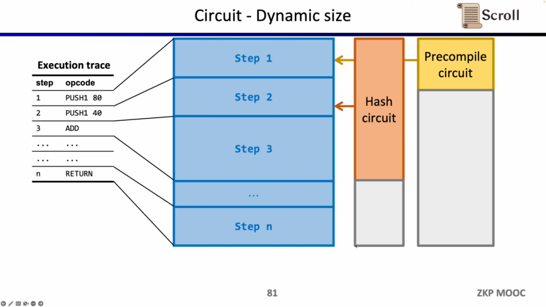 电路方面第三个有趣的研究问题是动态规模。因为不同的操作码的电路规模不同,但为了满足动态变化的执行踪迹,每一步的操作码都需要满足最大的电路规模,例如Keccak哈希,因此我们实际上付出了额外的开销。假设我们可以使zkEVM动态适应动态变化的执行踪迹,这将节省不必要的开销。