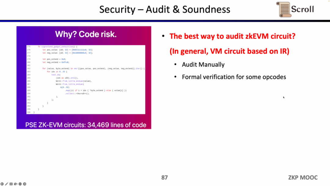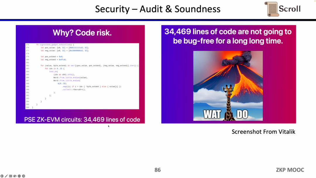 在构建zkEVM时,安全性是至关重要的。PSE 和 Scroll 共同构建的zkEVM有大约3万4千行代码,从软件工程角度,这些复杂的代码库在很长一段时间内是不可能没有漏洞的。Scroll 目前在通过大量的审计,包括业内最顶尖的审计公司,来审核 zkEVM 的代码库。