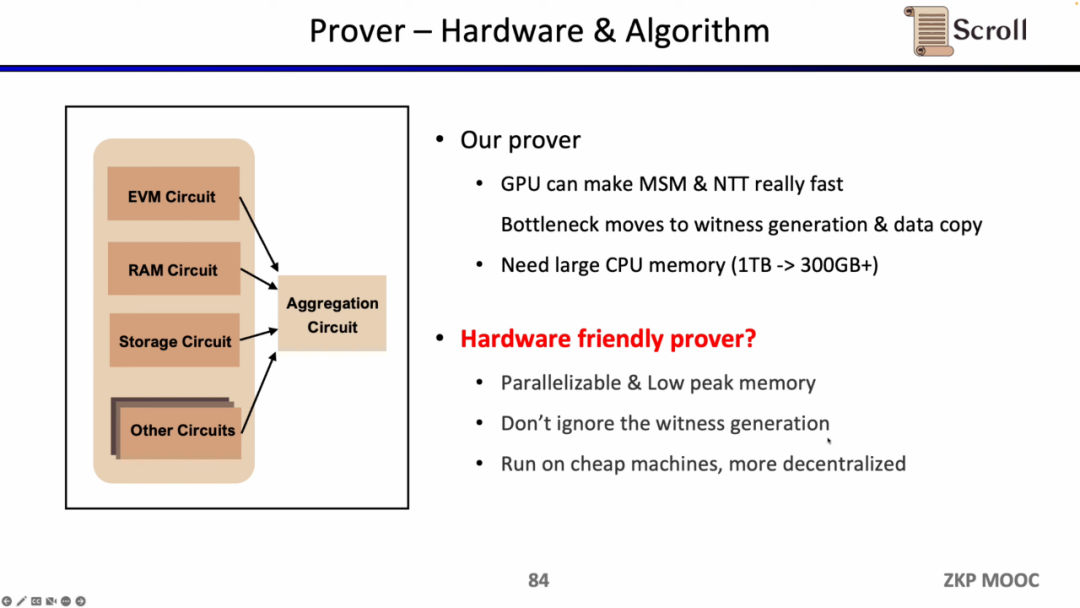 在证明者方面,Scroll 在 GPU 加速上已经对MSM和NTT进行了大量的优化,但现在的瓶颈转移到了见证生成和复制数据这块。因为假设MSM和NTT占据了80%的证明时间,即使硬件加速可以将这部分效率提升若干个数量级,但原先见证生成和复制数据20%的证明时间将变成新的瓶颈所在。证明者的另一个问题是需要大量的内存,因此也需要探索更便宜更去中心化的硬件方案。