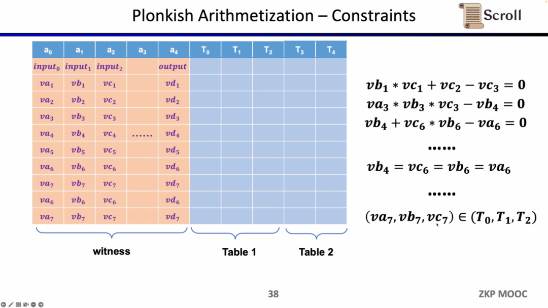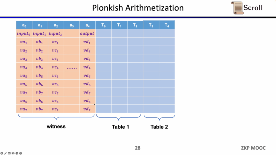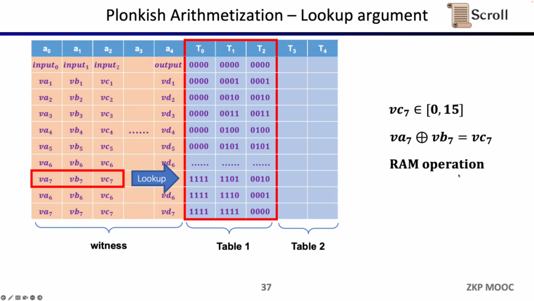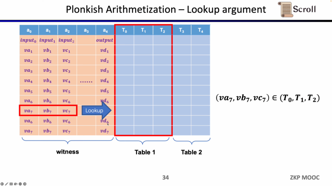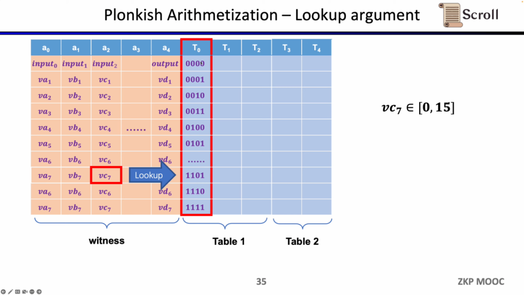 最后一种约束是查找表 (Lookup Table)。我们可以将查找表理解成变量之间存在一个关系,该关系可以表示成一个表。例如我们想要证明 vc7 在 0-15 范围内,在R1CS中你首先需要把这个数值分解为4位二进制,然后证明每位在0-1的范围内,这将需要四个约束。而在 Plonkish中,你可以将所有可能的范围列在同一列,只需要证明vc7属于该列即可,这对范围证明非常高效,在zkEVM中,查找表对于证明内存读写非常有用。