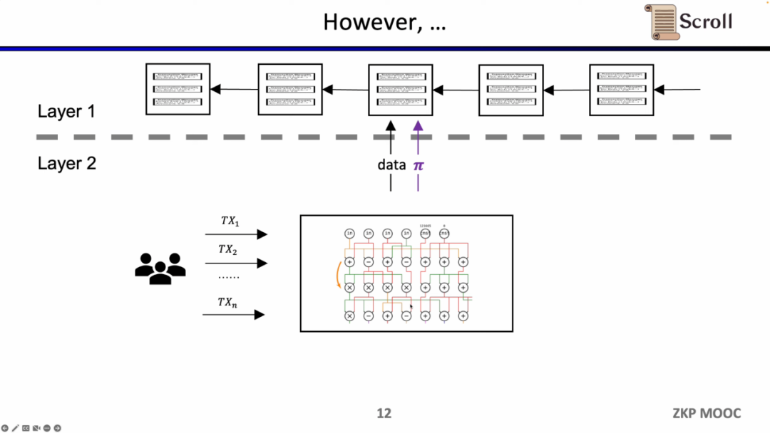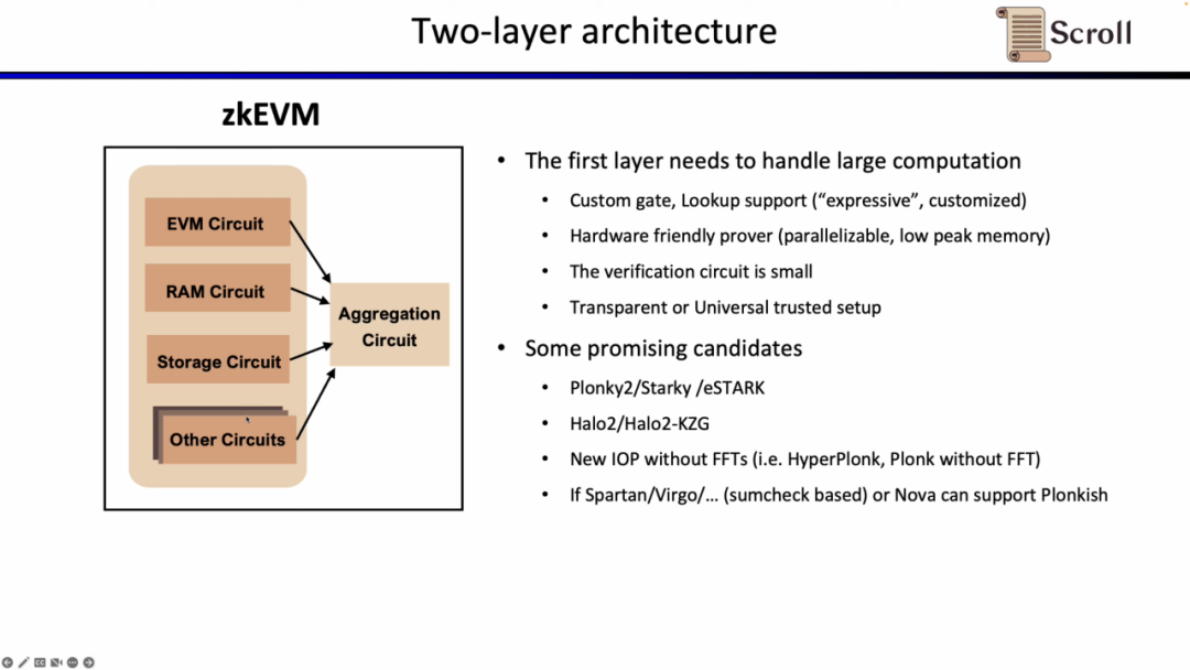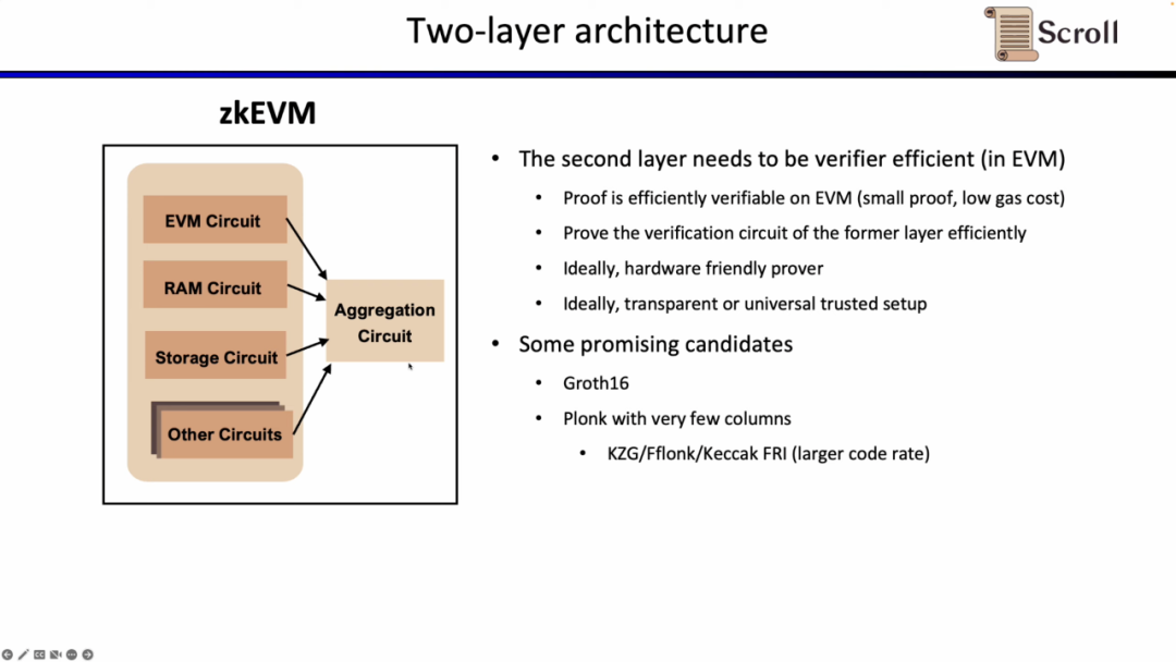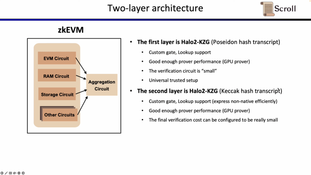 因为在L1上直接验证上述的EVM电路,内存电路,存储电路等,开销巨大,Scroll 的证明系统采用了两层架构。