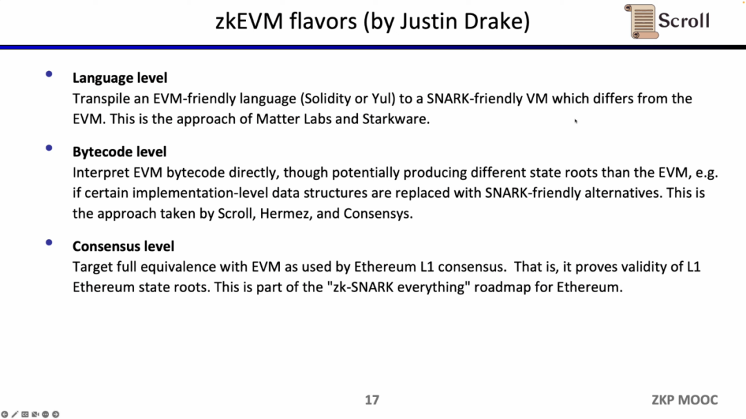 第二类是 Scroll 在做的字节码层面的兼容,是直接证明EVM的字节码处理正确与否,直接继承了以太坊的执行环境。在这里可做的一些取舍是,使用和EVM不一样的状态根,例如使用ZK友好的数据结构。Hermez 和 Consensys 也在做类似的事情。