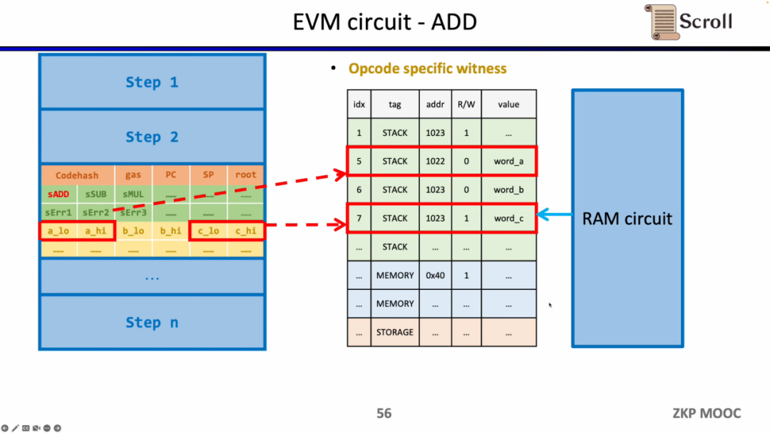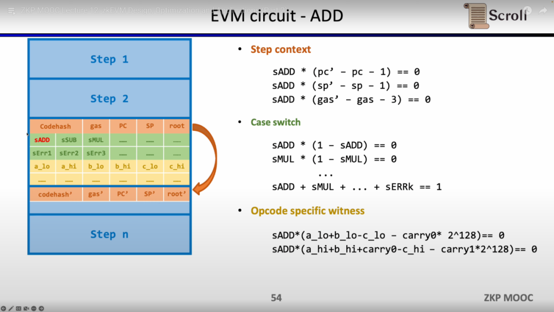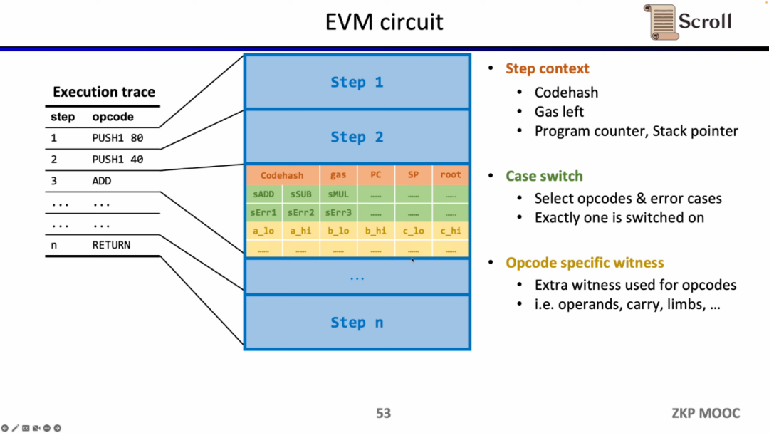 深入EVM电路细节,每一步执行踪迹都有对应的电路约束。具体来说,每一步的电路约束包含 Step Context,Case Switch,Opcode Specific Witness。Step Context 包含执行踪迹对应的codehash,剩余gas和计数器;Case Switch 包含所有的操作码,所有的错误情况,以及该步的相应操作;Opcode Specific Witness 包含了操作码所需的额外见证,例如运算数等。