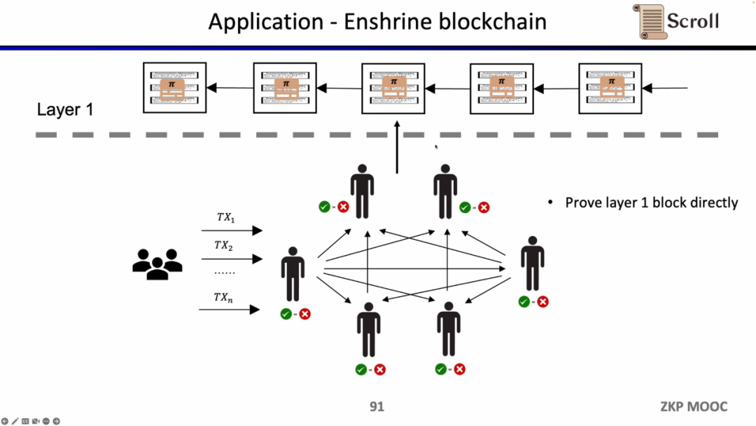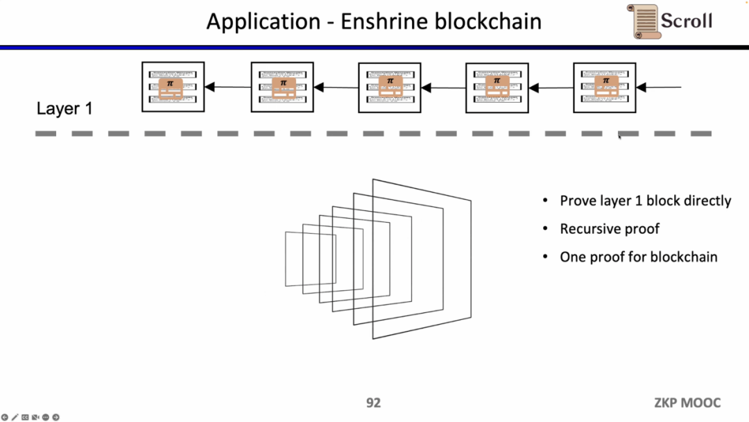 如果我们直接验证L1的区块,那么L1的节点就不需要重复执行交易,只需要验证每一个区块证明的有效性。这样的架构方案称为 Enshrine Blockchain。目前在以太坊上直接实现难度非常之大,因为需要验证整个以太坊区块,其中会包括验证大量签名,随之带来更长的证明时间和更低的安全性。当然也已经有一些其他公链在通过递归证明,使用单个证明,来验证整个区块链,例如Mina。