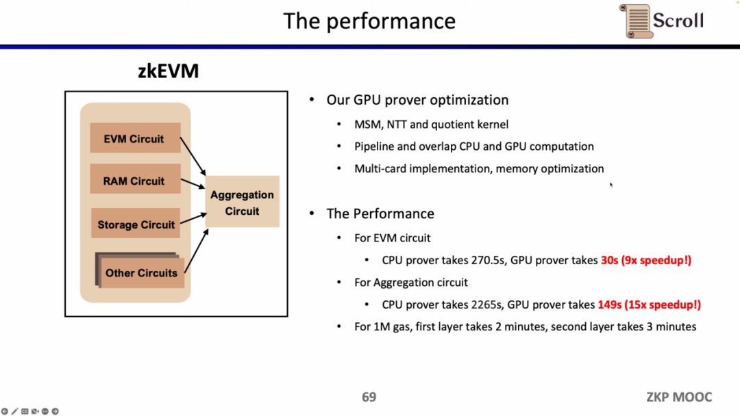 Scroll 在 GPU 硬件加速方面也做了非常多的研究和优化工作,对于EVM电路,优化后的GPU证明者仅需30s,相较CPU证明者提升了9倍的效率;而对于聚合电路,优化后的GPU证明者仅需149s,相较CPU提升了15倍的效率。在当前的优化条件下, 1M Gas 第一层证明系统大约需要 2 分钟,第二层证明系统大约需要 3 分钟。