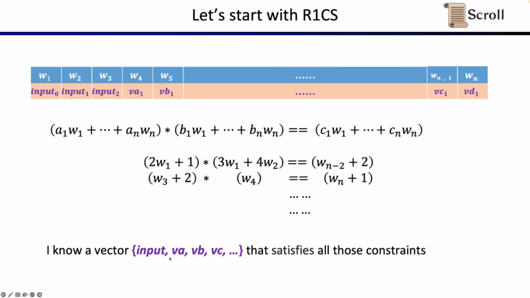 为了理解我们为什么使用这三者的方案。我们首先从最简单的 R1CS 开始,R1CS中的约束,是线性组合乘以线性组合等于线性结合。你可以加上任何变量的线性组合而没有额外的开销,但是在每个约束中阶数最大是2。因此对于阶数较高的运算,需要的约束就越多。