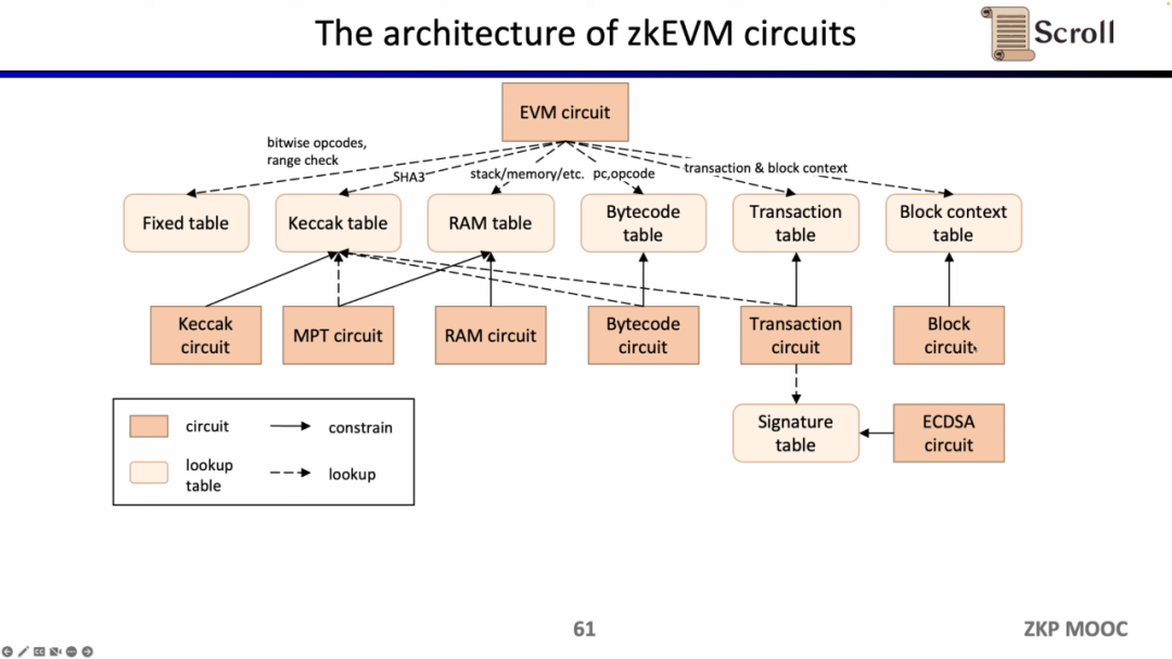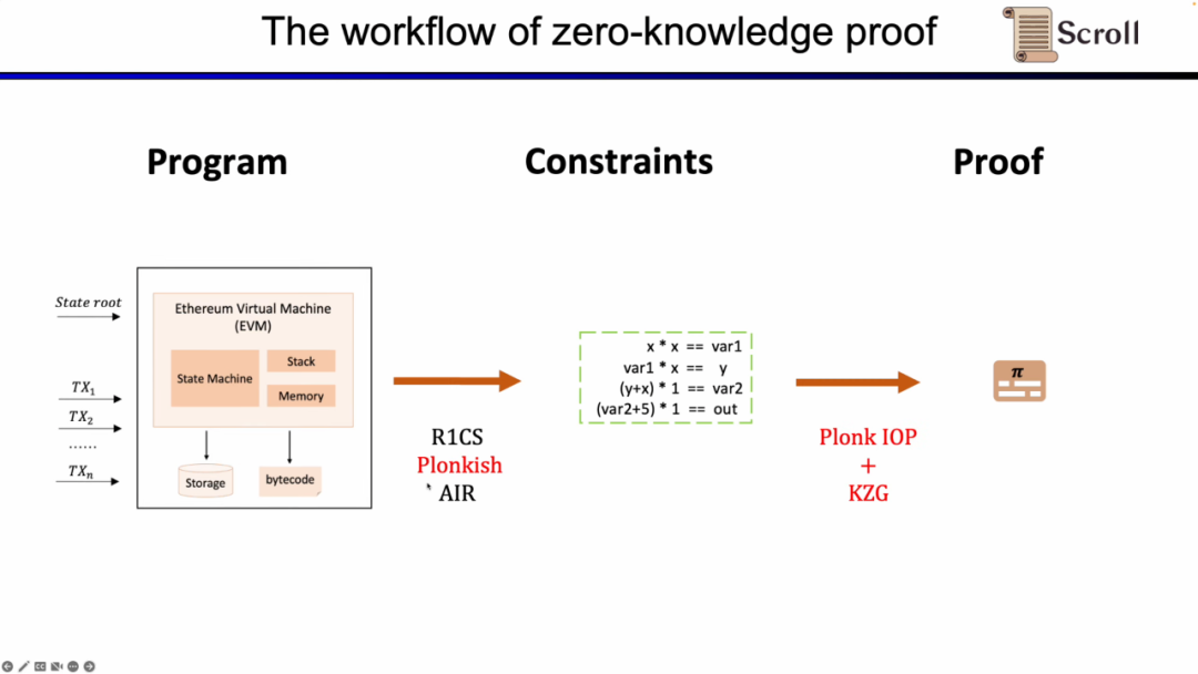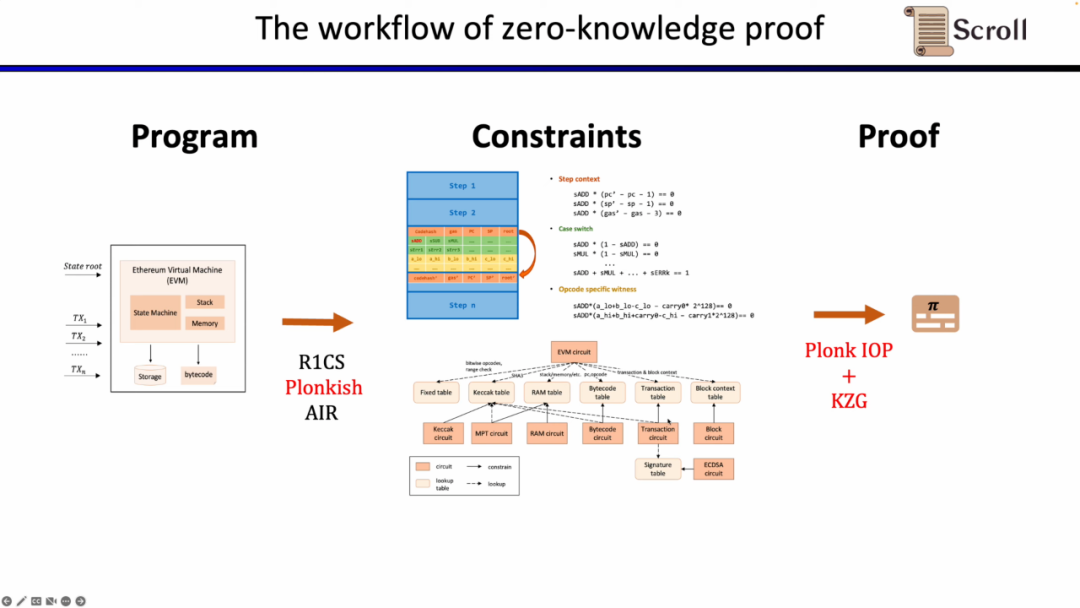 在这里我们需要证明 zkEVM,Scroll 使用的是Plonkish,Plonk IOP,以及KZG的组合。