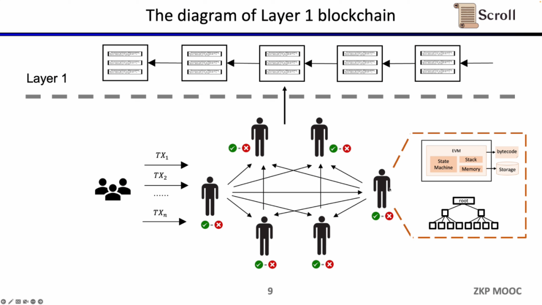 传统的Layer 1 区块链会有一些节点通过P2P网络共同维护。他们在收到用户的交易时,会在EVM的虚拟机内执行,读取调用合约和存储,并依照交易更新全局的状态树。