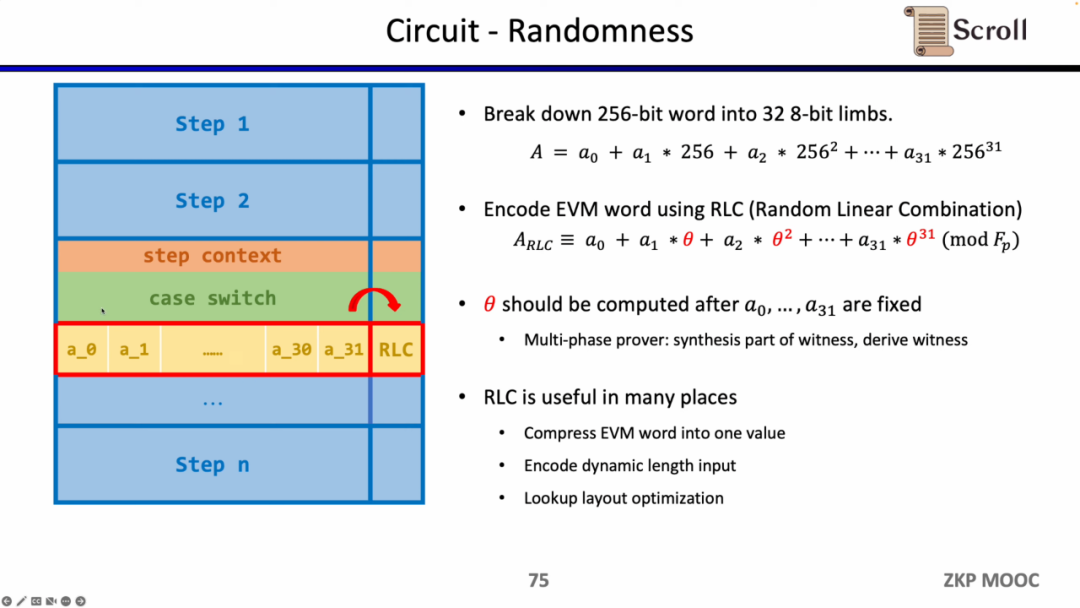 首先是电路中的随机性,因为 EVM 字段是256位,我们需要将其拆分成 32 个 8 位的字段,从而更高效得进行范围证明。随后我们使用随机线性组合(Random Linear Combination, RLC)的方法,利用随机数将32个字段编码成1个,只需要验证该字段就可以验证原始的256位字段。但是问题在于随机数的生成需要在拆分字段之后,才能确保不被篡改。因此 Scroll 和 PSE 团队提出了多阶段证明者的方案,来确保在字段拆分之后,再利用随机数生成RLC,该方案被封装在了 Challenge API 中。RLC在zkEVM中有许多应用场景,不仅可以压缩EVM字段成一个字段,也可以加密不定长的输入,或是优化查找表的布局,但仍然有许多开放性的问题需要解决。