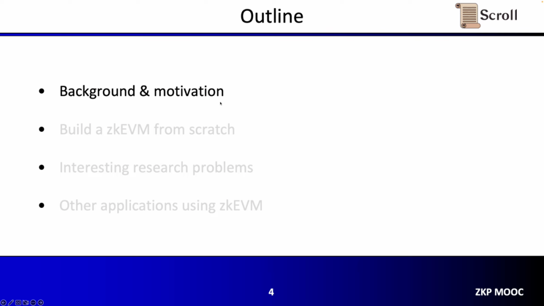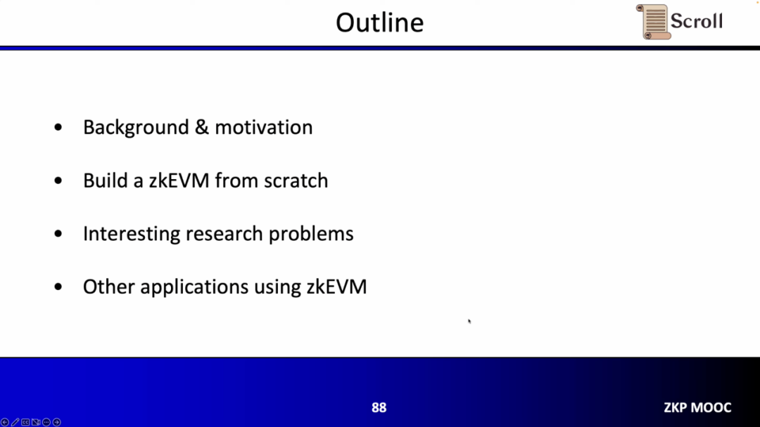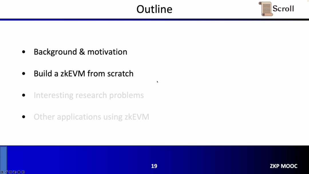 演讲分成四个部分,第一部分张烨介绍了开发背景以及我们为什么首先需要zkEVM以及为什么它在最近两年间变得如此受欢迎,第二部分通过一个完整的流程,讲解如何从头开始构建zkEVM包括算术化和证明系统,第三部分通过一些有趣的研究问题来谈论了Scroll 在构建 zkEVM时遇到的问题,最后介绍了一些其他使用zkEVM的应用。