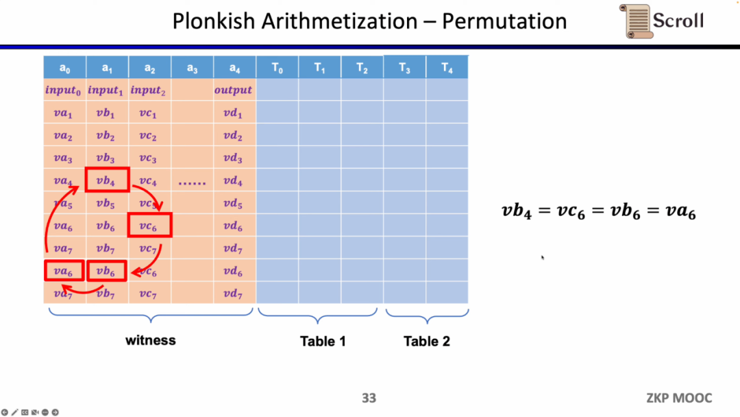 第二种约束是 Permuation,即等价性校验 (equality checks)。可以用来检查不同单元格的等价性,常用于关联电路中的不同门,比如证明上一个门的输出等于下一个门的输入。