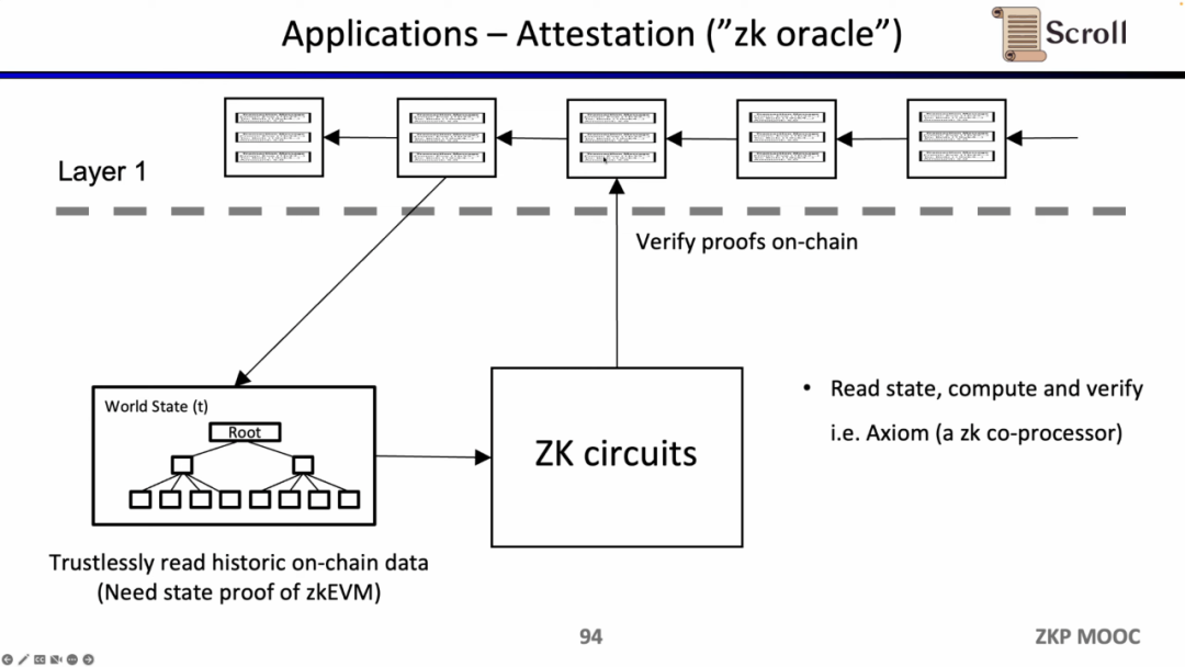 最后一个用例是,是通过零知识证明来证明对历史数据的声明,作为预言机来使用,目前Axiom正在做这方面的产品。最近的ETHBeijing 黑客松上,GasLockR团队正是利用了这一特性,证明了历史的Gas开销。