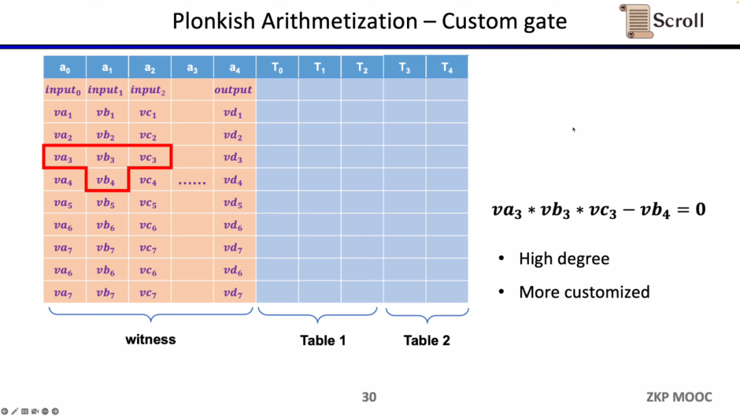 第一种约束是自定义门(Custom Gate),你可以定义不同单元格之间的多项式约束关系,例如 va3 * vb3 * vc3 - vb4 =0。相比R1CS来说,阶数可以更高,因为你可以定义任何一个变量的约束,并且可以定义一些非常不一样的约束。
