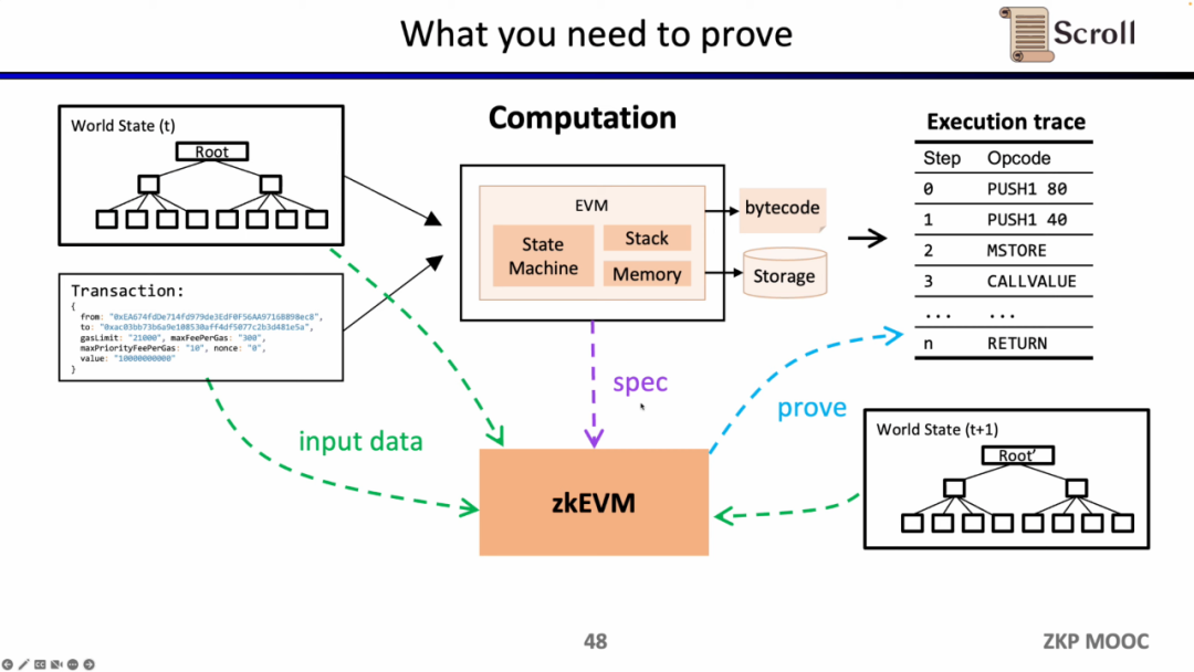 接下来,我们看zkEVM的完整流程,基于初始的全局状态树,一笔新的交易进来后,EVM会读取存储和调用的合约的字节码,根据交易生成相应的执行踪迹例如PUSH, PUSH, STORE, CALLVALUE,然后逐步执行更新全局状态,得到交易后的全局状态树。而zkEVM是将初始的全局状态树,交易本身,以及交易后的全局状态树作为输入,根据EVM的规范,来证明执行踪迹的执行正确性。
