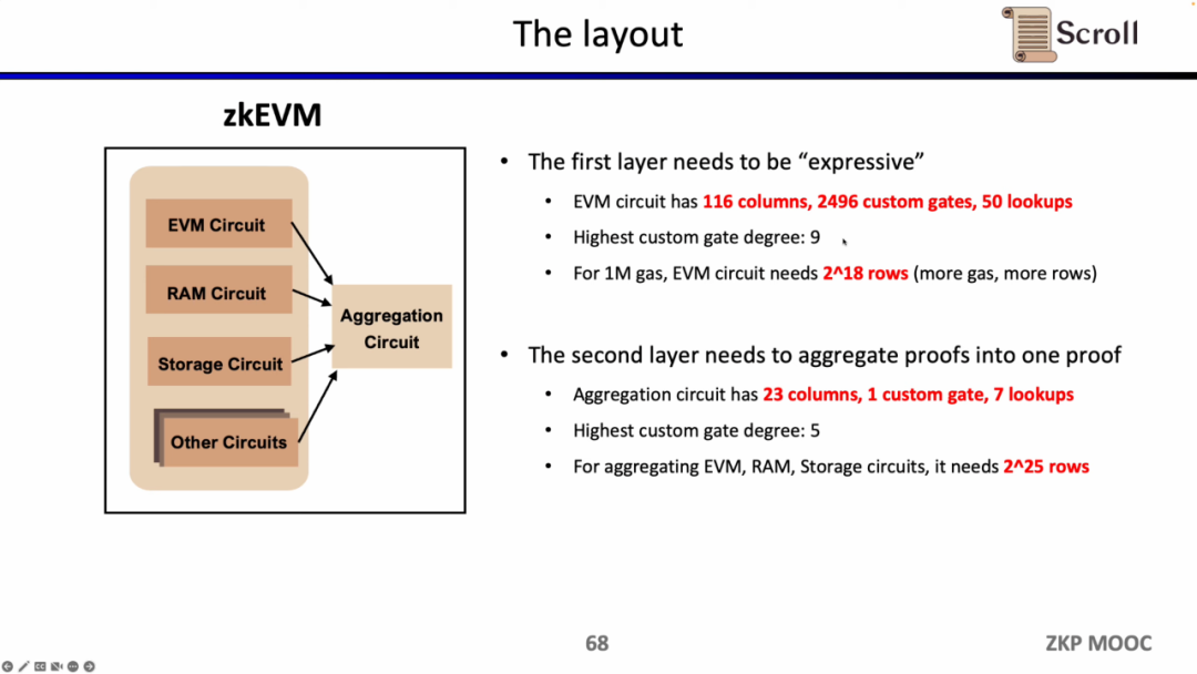 当前实现下,Scroll 的第一层证明系统EVM电路有 116 列,2496 个自定义门,50 个查找表,最高阶数为9,1M Gas下需要2^18行;而第二层证明系统的聚合电路仅有 23 列,1个自定义门,7 个查找表,最高阶数为 5 ,为了聚合EVM电路,内存电路,存储电路,需要2^25行。