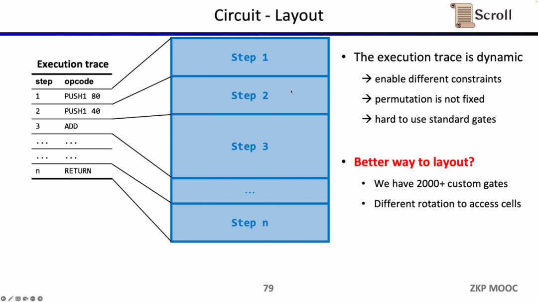 电路方面第二个有趣的研究问题是电路布局。Scroll 前端之所以采用 Plonkish,是因为EVM的执行踪迹是动态变化的,需要能支持不同的约束,变化的等价性检验,而R1CS的标准化门需要更大的电路规模来实现。但Scroll 目前使用了 2000 多个自定义门来满足动态变化的执行踪迹,也在探索如何进一步优化电路布局,包括将 Opcode 拆分成 Micro Opcode,或是复用相同表格内的单元格。
