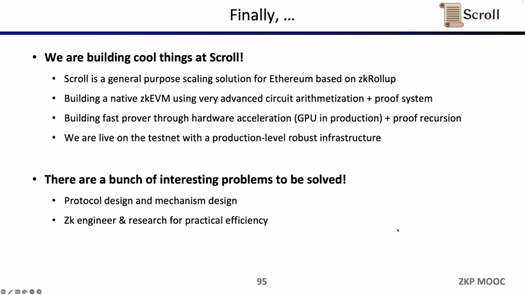 当然仍然有一些有趣的问题需要解决,包括协议设计和机制设计,零知识工程和实际效率,欢迎大家加入Scroll一起构建!