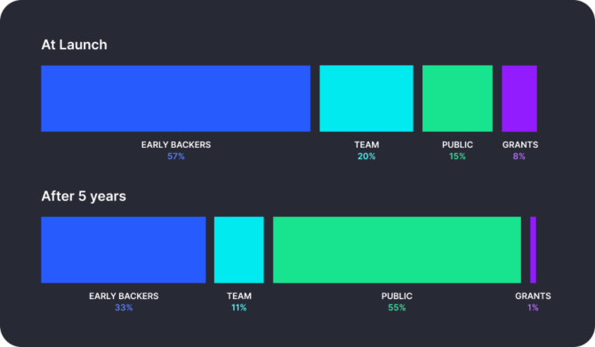 除了在 Aleo 团队、早期支持者和社区成员之间分配的代币起始供应外,还将留出一部分用于在Aleo主网启动后的某个时候进行更广泛的分发,目的是进一步分散控制并提高开源社区的质量,同时遵守适用的法律和法规。