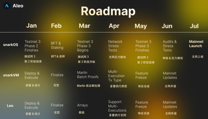 Aleo项目目前处在测试网三,还没有进入第三阶段(测试网三分成三个阶段)。根据其发布的2023路线图,预期4月将会进入测试网三第三阶段,并在5月结束测试网三第三阶段,在6月经过压力和审核测试、主网升级后,将于7月上线主网。