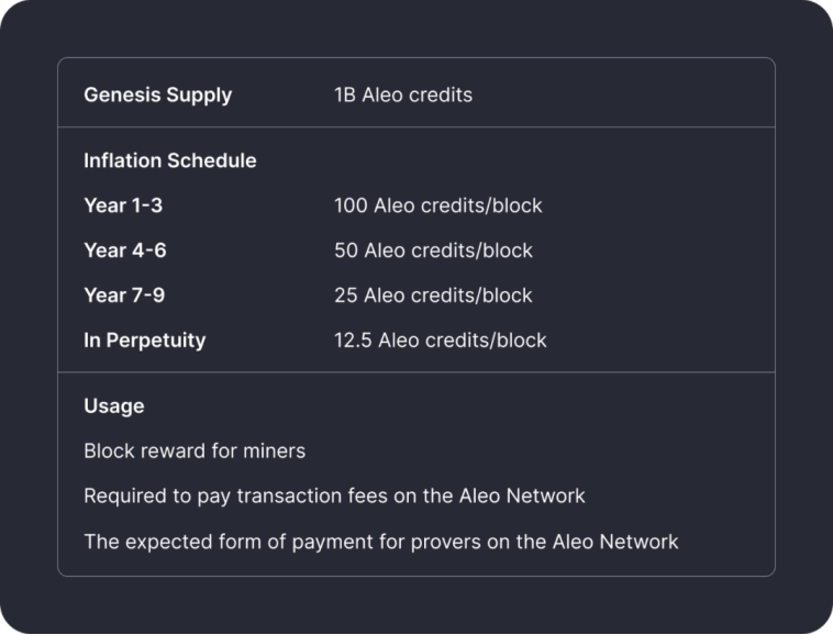 Aleo的代币经济学旨在以尽可能简单的方式调整Aleo系统中所有利益相关者的激励措施,为Aleo网络提供服务。其代币表示有意义的价值,为参与者提供的安全性给予奖励,促进生态系统的开发和使用及权力下放等。并且,团队保留在迭代主网时进行必要调整的权利。