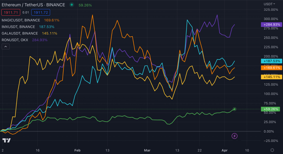 该行业在 2023 年迄今为止表现出了强大的潜力,类似 MAGIC、IMX、RON 和 GALA 等游戏Token今年迄今表现优异,超过了 ETH。
