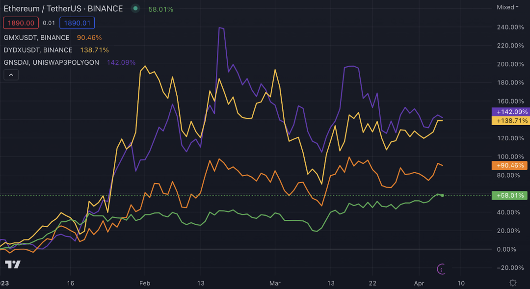 这种增长导致了许多优秀的永续合约协议治理Token的表现优于 ETH,例如 dYdX(DYDX)、GMX(GMX)、Gains Network(GNS)和 Kwenta(KWENTA)等。