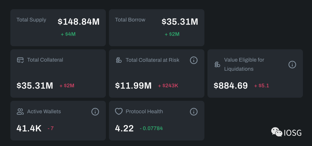 风险监控器是确保 BENQI 协议健康的核心仪表盘之一。该仪表盘评估了供应/借款/铸币/储备资产的分布。除分布外,它还包含一些总体数据,如抵押品、借款、清算和活跃钱包。