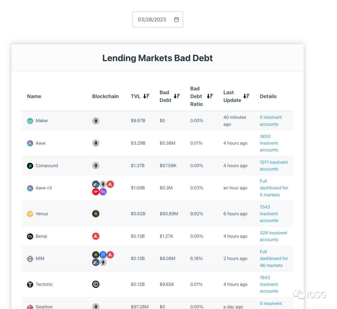 不良债务仪表盘包括主要协议的不良债务相关信息。用户还可以按日期查看。
