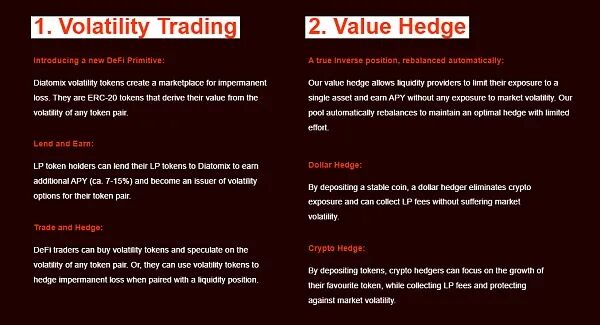 - 波动率交易:Diatomix 创建了一种基于代币对的波动性代币,LPs 可以将他们的 LP 代币借给 Diatomix 以赚取额外的 APY(约 7-15%),并成为波动性代币的发行人。而 DeFi 交易者可以推测任何代币对的波动率,并购买对应的波动性代币来对冲无常损失。