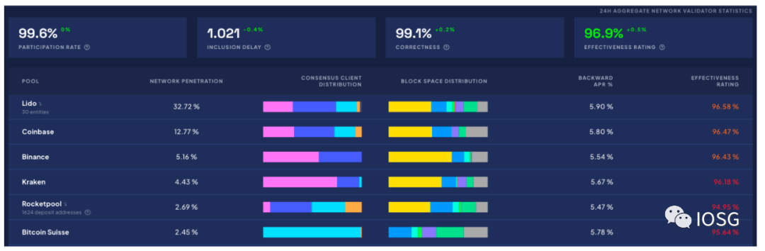 从数据角度看,Rated根据Proposal Effectiveness、Attestation Effectiveness和 Slashing Record等维度提供了各质押服务商的评级。以太坊验证者的整体Effectiveness水平约为96.9%,尚未达到理想水平。