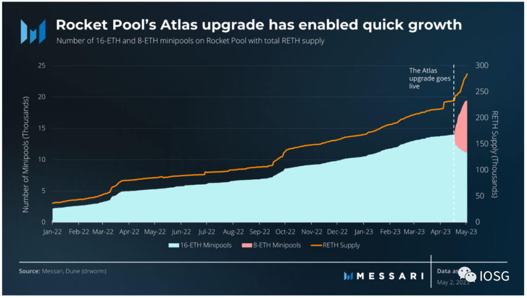 在节点运营供给一侧,Rocketpool在Shapella升级之际顺势推出了Atlas升级—— 相较于之前的16 ETH,当前节点运营商仅需投入8 ETH就可以运行验证服务,进一步降低节点运营商的准入门槛(运行两个8 ETH的Minipool比运行一个16ETH 的Minipool提供超过18%的奖励)。上图显示Atlas激活为Rocketpool带来了一定幅度的协议增长。