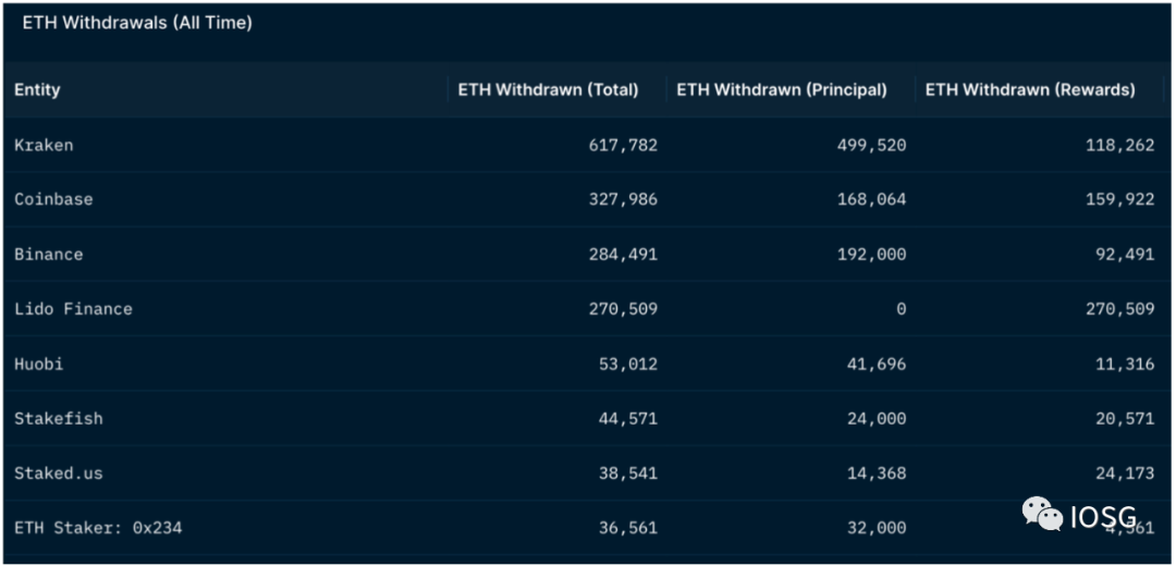 在Shapella后,早期质押用户能够提款并转向其他质押服务——提款队列中前三的实体均为中心化交易所反映了这一点。