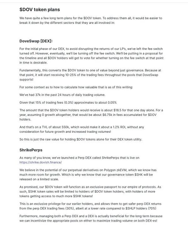 项目方也在一些资金池中将平台币 $DOV 作为激励,但是 wETH/DOV LP 很薄,只有 24 wETH 配对,流动性很低。我不确定 $DOV 将如何获得它的价值,可以之后关注一下。
