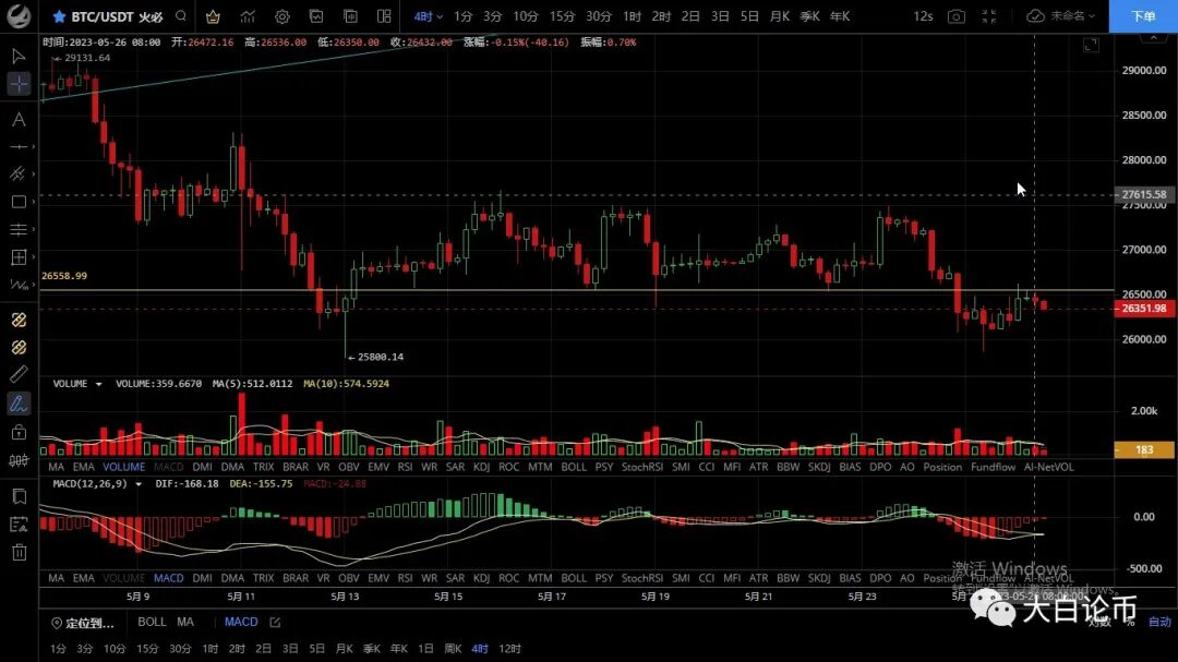 大饼昨日低位跌至25870附近后支撑反弹,随后行情一路震荡上行,最高触及26630附近承压回落,目前币价在26430附近运行,四小时级别k线实体未破震荡区间走出触底反弹,上方多次试探26500阻力区域都未曾突破而回落,macd空头逐步缩量双线处于底部有金叉迹象,短期行情受ma14均线支撑未能延续空头下跌,日内重点关注能否突破站稳26500上方,不破有机会试探25300大的支撑,整体思路继续看空反弹后进场,上方压制26500-26800,下方支撑25800-25300