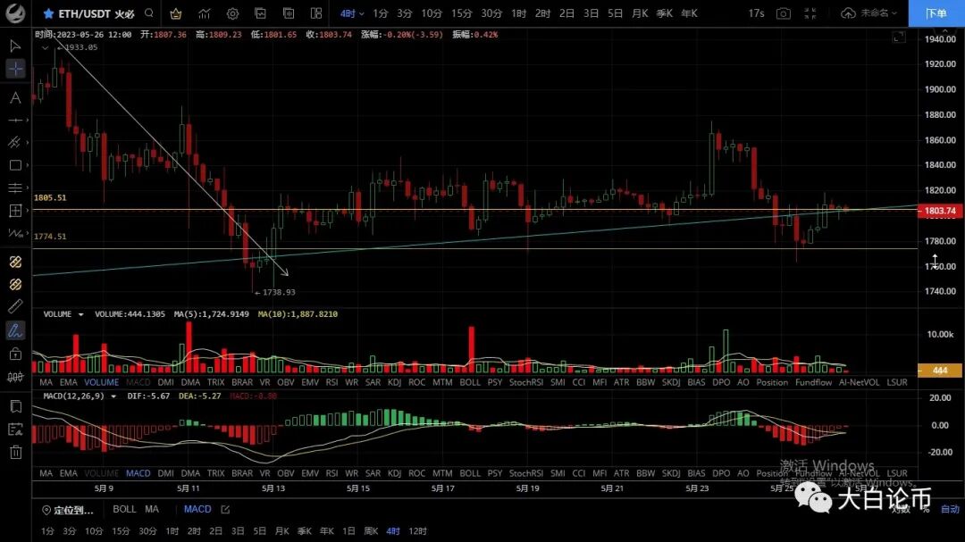 以太坊昨日整体同样呈震荡上行走势,凌晨行情最高触及1818一线承压回落,昨日空单小幅获利,目前币价在1803附近运行,四小时级别短期行情止跌反弹,k线连阳上行,但未能延续多头走势,macd空头逐步缩量双线粘合震荡,行情上行受阻而回落下方先关注ma7均线支撑,若破位则会再探前低附近,整体走势偏弱势,上方阻力较强看向下破位的思路不变,目前整体依旧是在区间内震荡,日内思路建议反弹高空为主低多为辅,上方压制1820-1840,下方支撑1780-1760