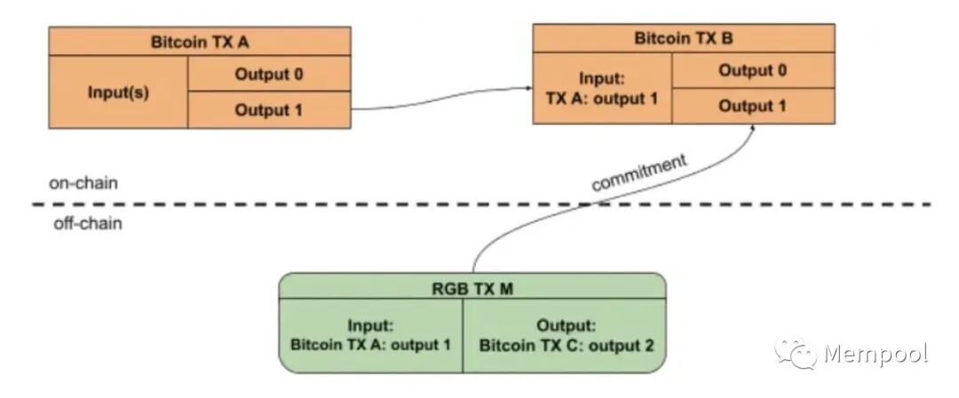 - RGB交易是把代币从比特币交易输出1转移到比特币交易C的输出2。