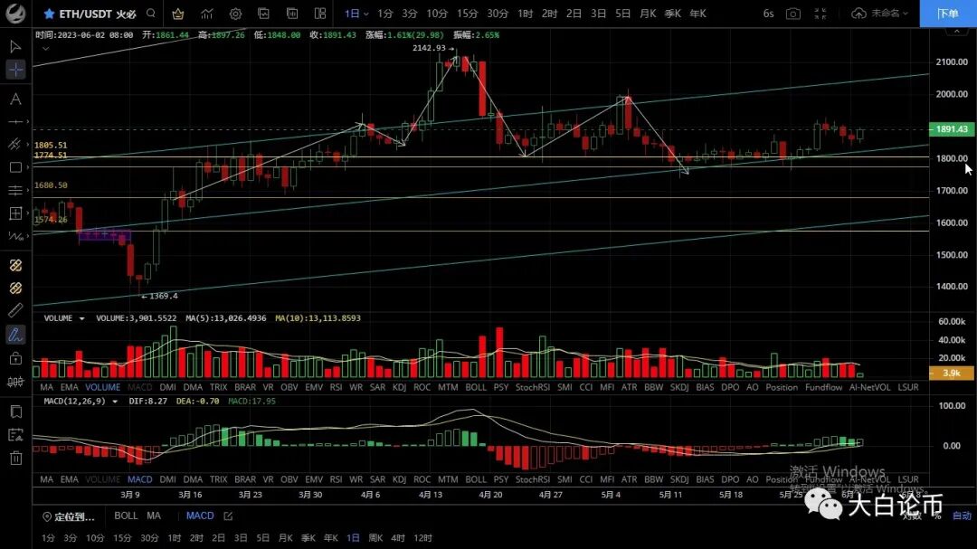 以太坊近期整体结构比大饼强势,昨日行情下跌至1840一线支撑后反弹,高位触及1882一线受阻回落未破前低再次上行,恭喜跟上昨日思路的朋友空单获利40点,目前币价在1891附近运行,四小时级别经过两日底部震荡后下方1840支撑有效,早间行情选择向上突破,macd空头逐步缩量双线处于零轴上方有金叉迹象,短期行情站稳ma30均线上方,多头表现较为强势,目前来看还有上行需求做空请谨慎,日线级别回踩至ma14均线支撑反弹呈阳包阴形态,若收线后再次回踩ma7和14均线不破可尝试做多,日内思路建议回踩低多为主高空为辅,上方压制1910-1930,下方支撑1880-1860