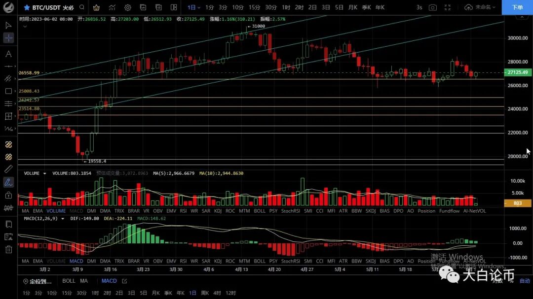 大饼昨日低位跌至26620一线后支撑反弹,随后行情震荡上行,在27134附近受阻后继续回落,最低跌至26512一线迅速收回,恭喜跟上昨日思路的朋友空单获利500点,目前币价在27127附近运行,四小时级别早间开盘行情向下插针跌破前低后迅速反弹收阳,可见下方支撑较强,目前行情站稳ma7后连阳上行,macd空头逐步缩量双线聚拢有金叉迹象,短期反弹虽有力度,但上方阻力较强27500不破依然看下跌走势,日内思路建议反弹高空为主低多为辅,上方压制27300-27500,下方支撑26800-26500