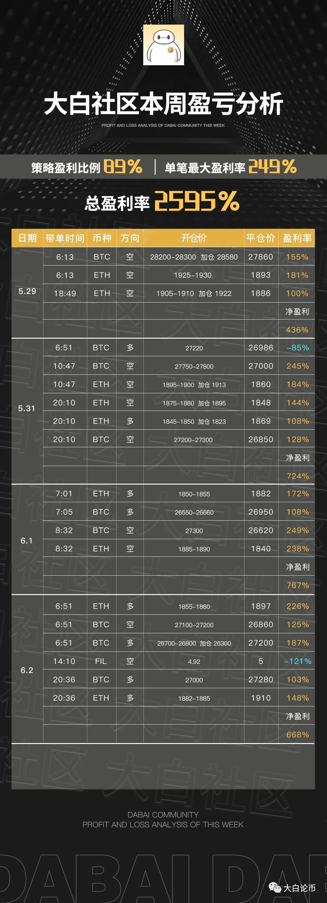 下方是大白社区本周实盘群单子,恭喜跟上的币友,如果你操作不顺,可以来试试水。