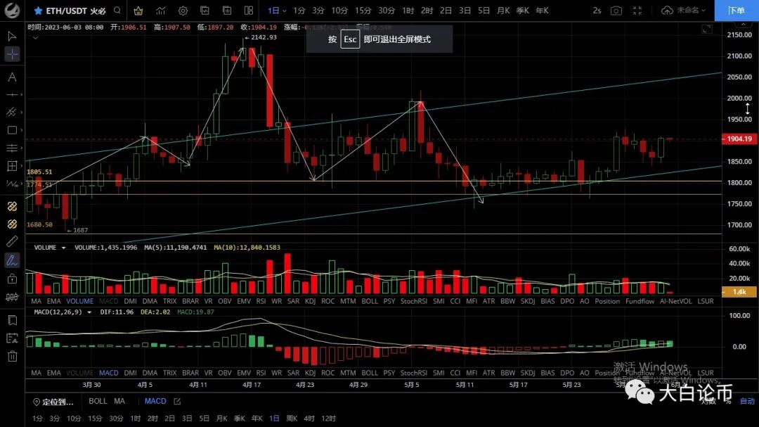 以太坊昨日二次下探未破前低走出强势反弹,最高触及1910一线承压回落,恭喜跟上昨日思路的朋友多单获利40点,目前币价在1903附近运行,四小时级别行情两次触及1910一线后回落,但回踩力度不大,下方触及ma7均线支撑再次上行,macd多头运行双线呈金叉状态,但量能比较弱,整体走势偏向震荡,上方不突破1930依然要走回落,短期先关注1910站稳情况,周末预计不会有太大波动,近期行情将会变盘预计上行突破的概率较大,后市回踩支撑可以低多为主高空为辅,上方压制1910-1930,下方支撑1880-1860