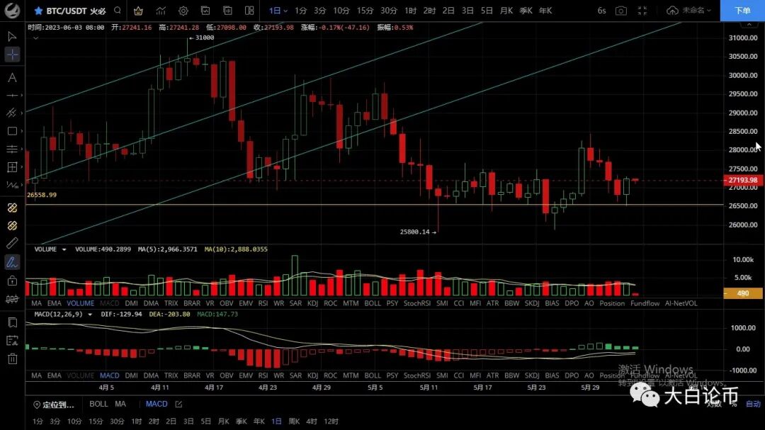 大饼昨日早间跌至26512一线后止跌反弹,随后行情震荡上行,最高触及27300一线受阻回落,恭喜跟上昨日思路的朋友空单获利近500点,目前币价在27180附近运行,四小时级别行情触底反弹后受ma30均线压制无法延续多头走势,macd虽呈多头但无量双线呈金叉状态,ma7均线向上指引,短期走势虽偏向多头但上行力度不大,因周末原因走势较为缓慢,同样上方临近压力不太容易突破,大饼整体走势依旧偏弱短期思路依然是看空,周末没行情建议观望一下,上方压制27500-27800,下方支撑27000-26800