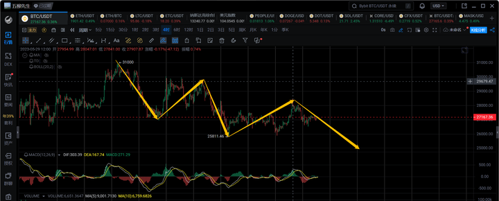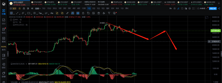 大饼这里预期目前不变,正常来说下周是应该要变盘了,震荡的比较久了,暂时是预期向下破25000的,最终去22500附近。当然也有很多的小伙伴看法跟我不一样,他们认为再次去突破31000。不管怎样,耐心等待行情走出来,多空都做好自己的风控就行了,毕竟行情的涨跌需要看市场进一步的变化。