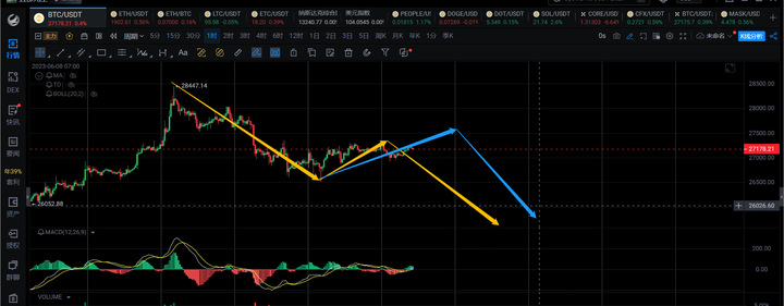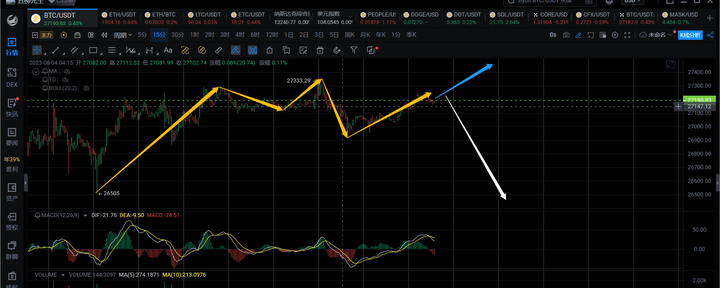 15分钟级别,昨晚上冲了一波到27333,本来到这个位置其实1h级别的反弹是可以结束了的,凌晨也走出了一笔15分钟级别的回调破了27000,但是今天白天又再次反弹到27200上方了,所以这里就不好说会不会再继续向上延伸突破27333,如果继续延伸至少会摸下27500,甚至再高一点。如果没有延伸的话,这里就应该继续往下走。