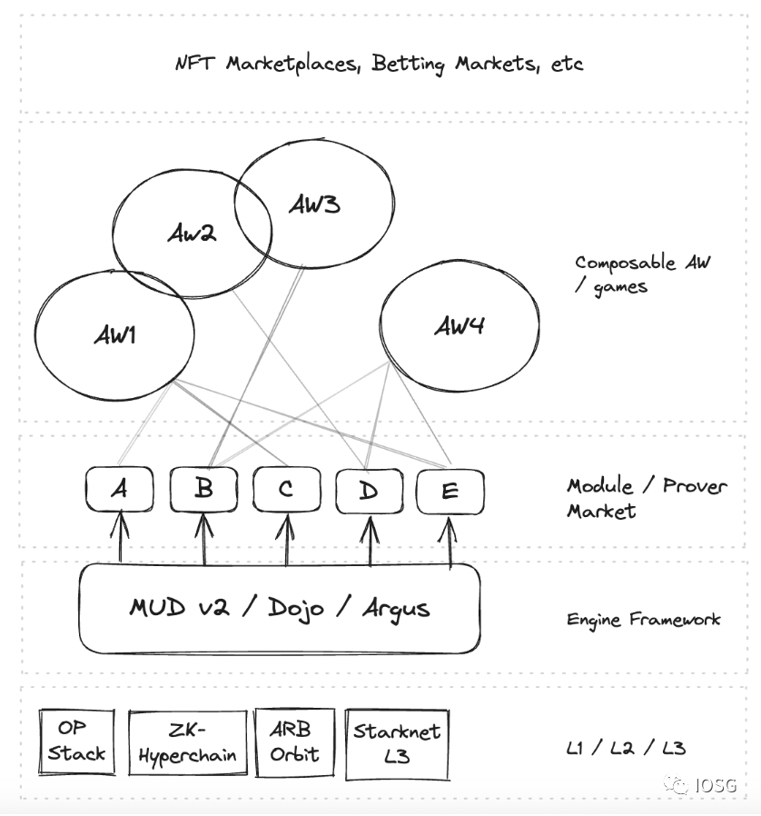 如果我们想象游戏引擎生态系统的进化,它们的网络效应和价值累积层可能如图所示。模块/验证器市场很容易被类似于Gnosis Safe 模块的引擎层吞没。默认情况下,AW层是可组合的,但这取决于游戏开发者和玩家对可组合性级别的选择。许多公司正试图在这个堆栈中捕获2层或更多的层。