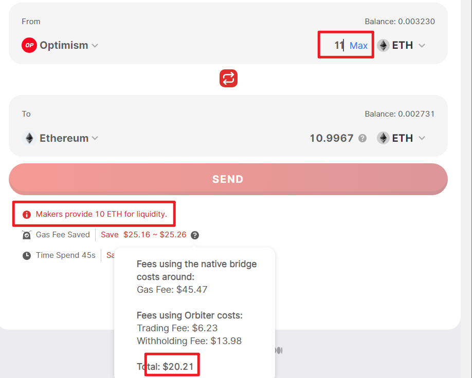 而二层跨到主网的费用就高了,14U 手续费起步,跨链金额越大,手续费也是越高,最高可以到 20U,再高就没有了,因为 Orbiter 的 Maker 对跨到主网的资金做了限制,最大只有 10E。