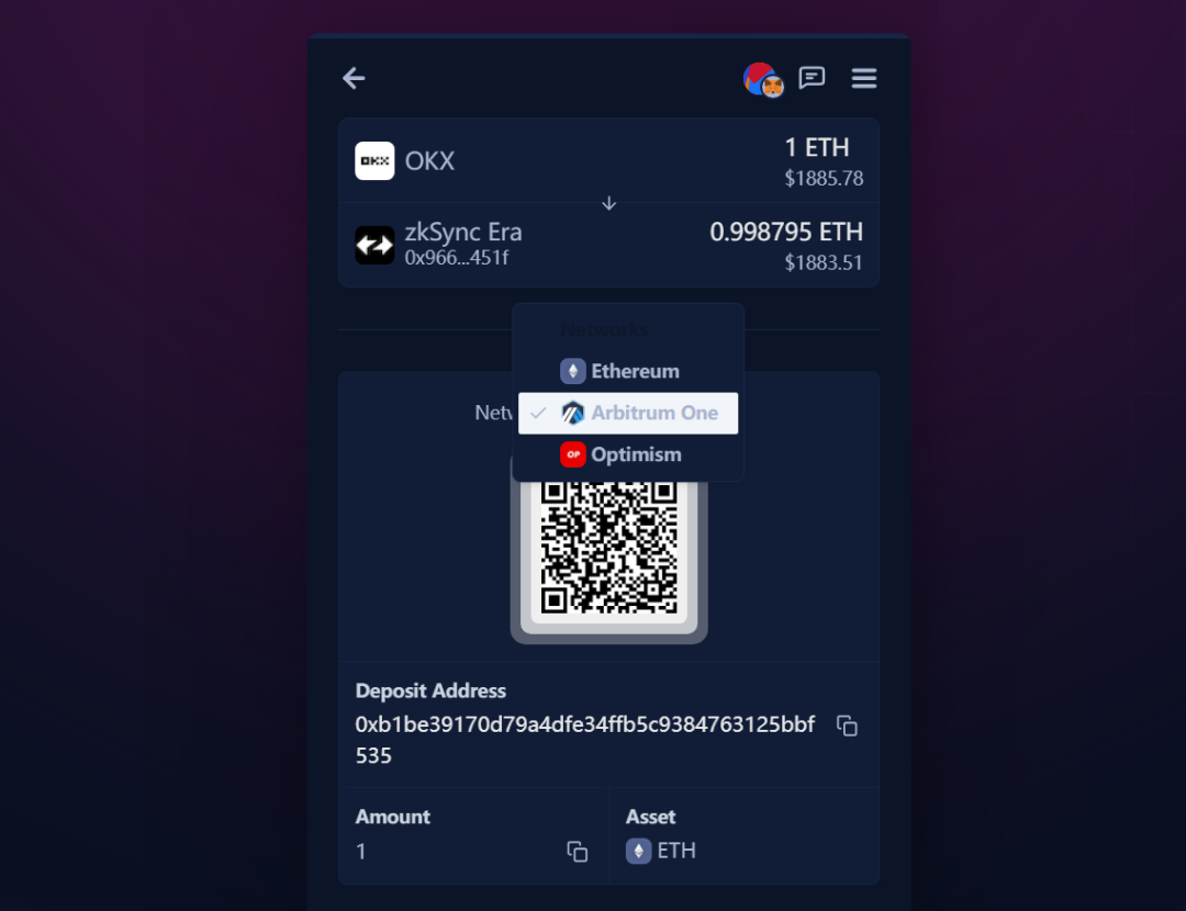 选好 OKX 和 zkSync Era 之后,输入要跨链的金额,这里代币种类无法更改,只有 ETH 可以选,而且限制最大 1 ETH。