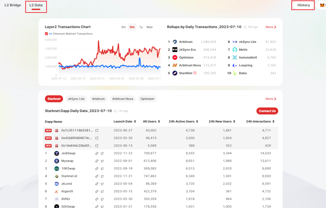 如果想要查看自己跨链的历史,可以在右上角的 History 查看。除了跨链的功能,orbiter 还推出了一个 L2 的数据看板,点击左上角的 L2 Data,就可以看到二层整体的交易数据以及各个项目单独的数据。