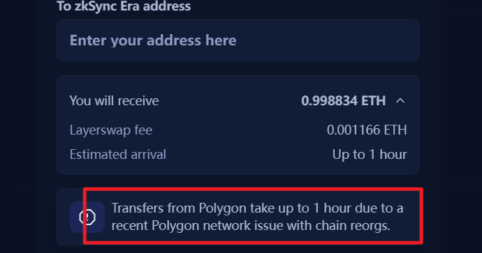Layerswap 跨链速度普遍都稍慢,基本都在2分钟左右。其中 polygon 跨链到 zkSync Era 的速度最慢,超过 1 个小时。